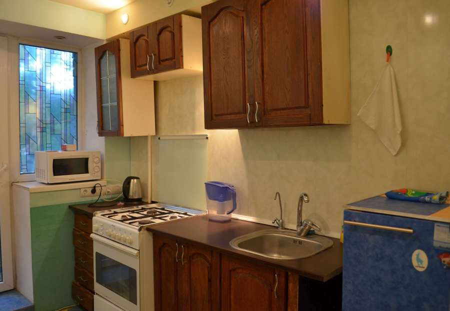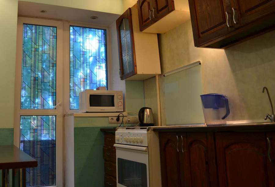 Кухня СВЧ, холодильник, утюг, чайник, фильтр для воды, выход на балкон.