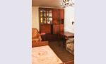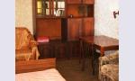 Комната двуспальная кровать, диван, стенка, столик, утюг и телевизор.
