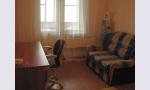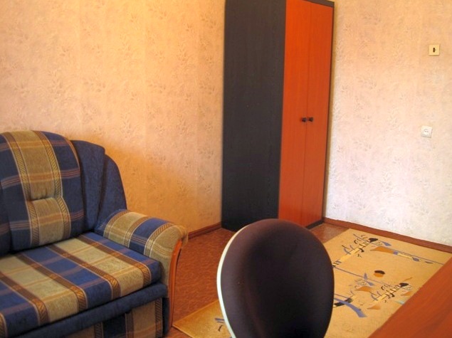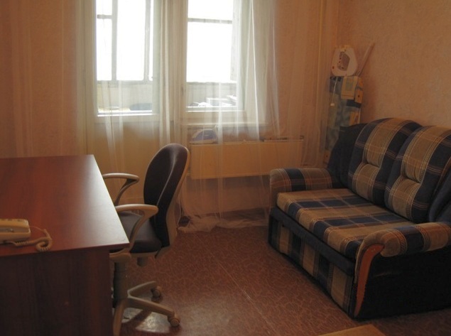 Комната диванчик, письменный стол, кресло, телефон, шкаф.